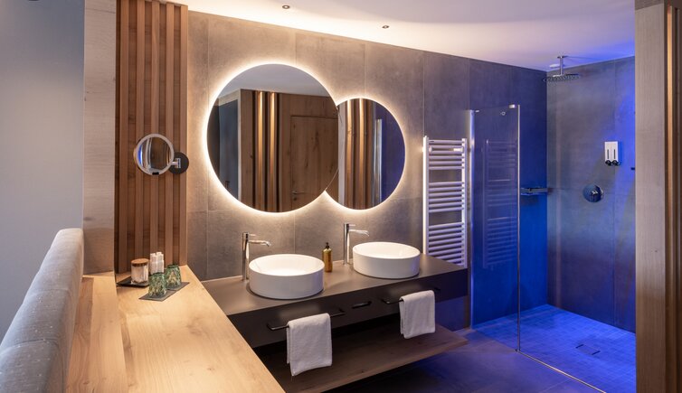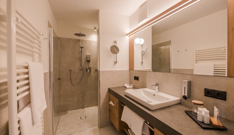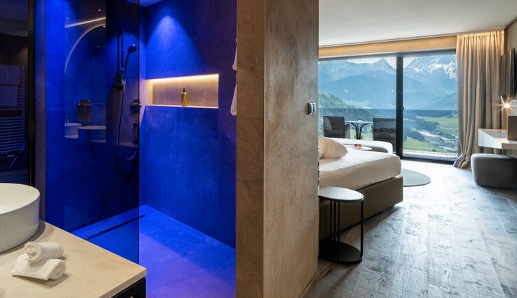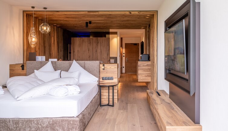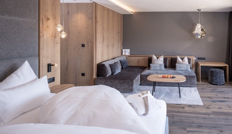 Godetevi la maestosa vista anche dalle confortevoli camere e suite, arredate con amore, in uno stile montano ma elegante e con molto legno.